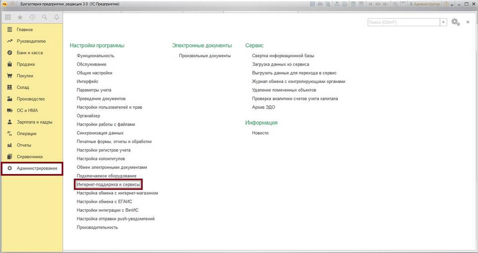 - В конфигураторе выберите "Конфигурация" → "Поддержка" → "Настройка поддержки"